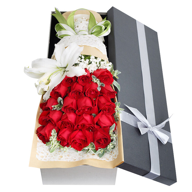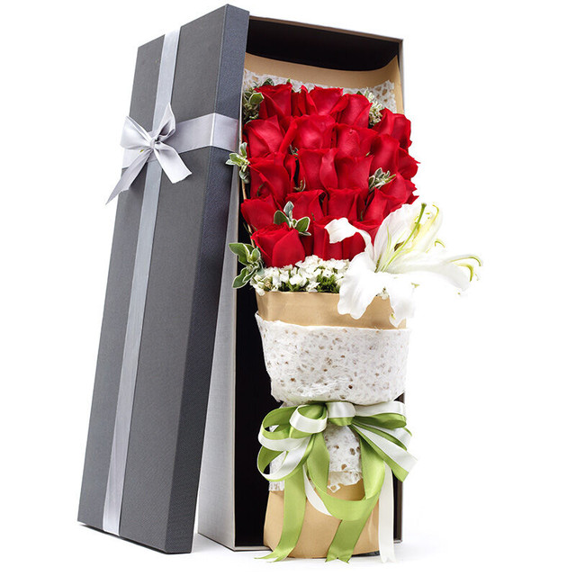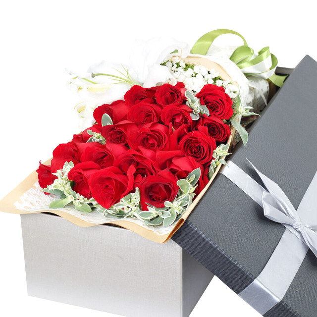 - 花材:19朵红玫瑰,1朵香水百合,高山积雪、相思梅