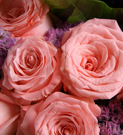 - 花材:戴安娜粉玫瑰11枝,紫色桔梗5枝,粉色勿忘我3枝,栀子叶0.5扎