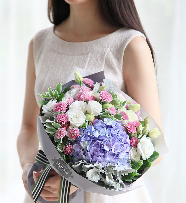 - 花材:深蓝色绣球1枝,紫色小雏菊4枝,银叶菊0.3扎,叶上白0.5扎,白色洋桔梗0.5扎