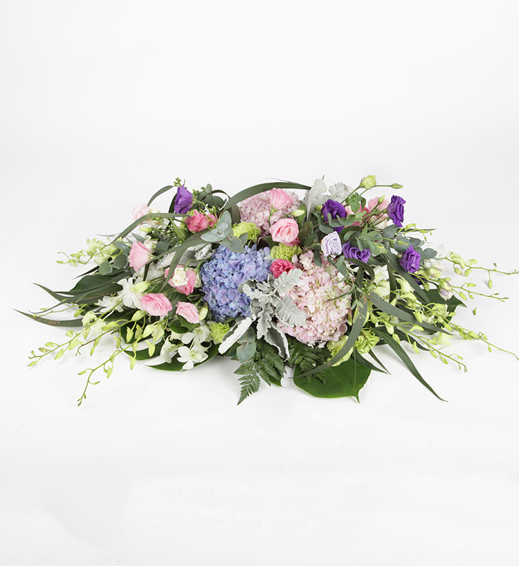 - 花材:蓝紫色绣球1枝、粉色绣球2枝、白色洋兰1扎、粉色紫色桔梗各半扎、搭配龟背、高山羊齿、尤加利叶、银叶菊